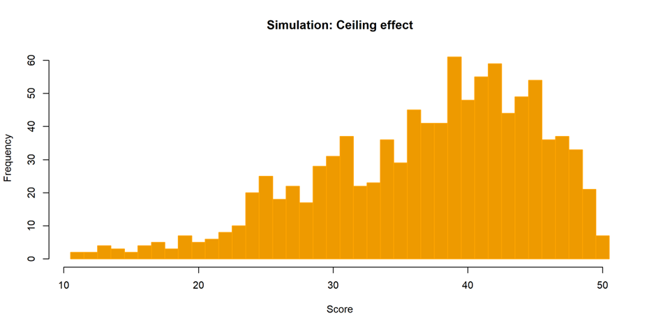 We can see the scores are skewed (the bulge is towards the right of the distribution), but is it really a ceiling effect? Only 6 pupils achieved the maximum score (less than 0.5%), so it doesn't look as though they are bashing up against the ceiling. I think many people would characterise it as a 'slight' ceiling effect. Another way to identify a ceiling effect is with a measure of skewness. This is a statistic that captures the degree of asymmetry. Here, the value is -0.9. Again, most experts would probably interpret this as slightly skewed.