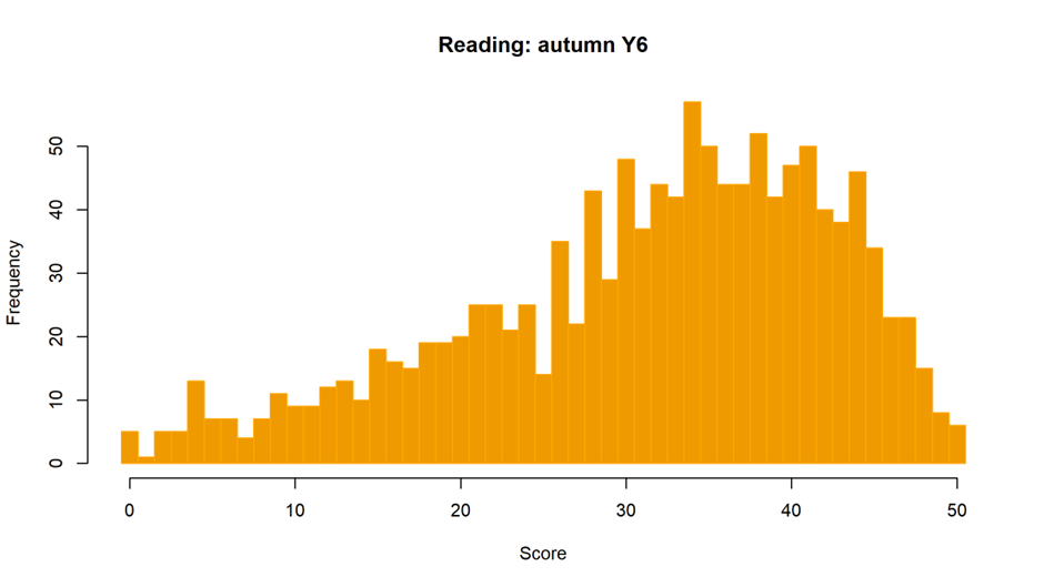 Considering how common they are, ceiling effects are surprisingly hard to define: there is no simple test for identifying them. A standard approach is just to look at the distribution of scores. Here is an example from one of the assessments in our TIDE dataset, a commercial assessment of reading, taken in autumn by 1,254 Year 6 pupils in 23 schools: