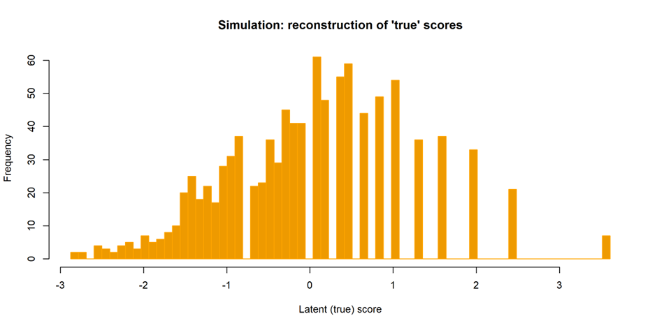 [1] I applied an Item Response Theory analysis to the simulated scores to reconstruct a theoretical 'latent' scale, producing the result shown.